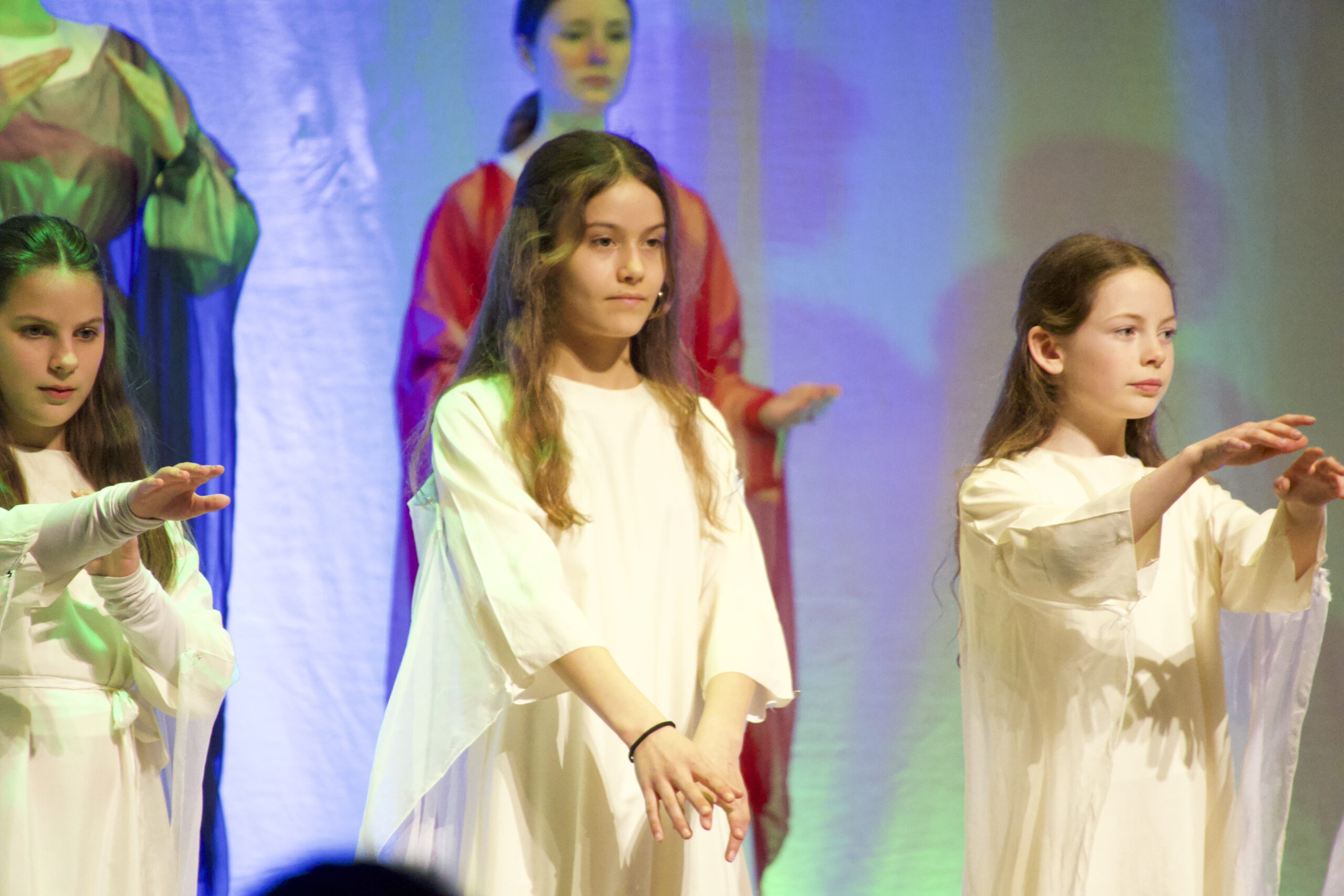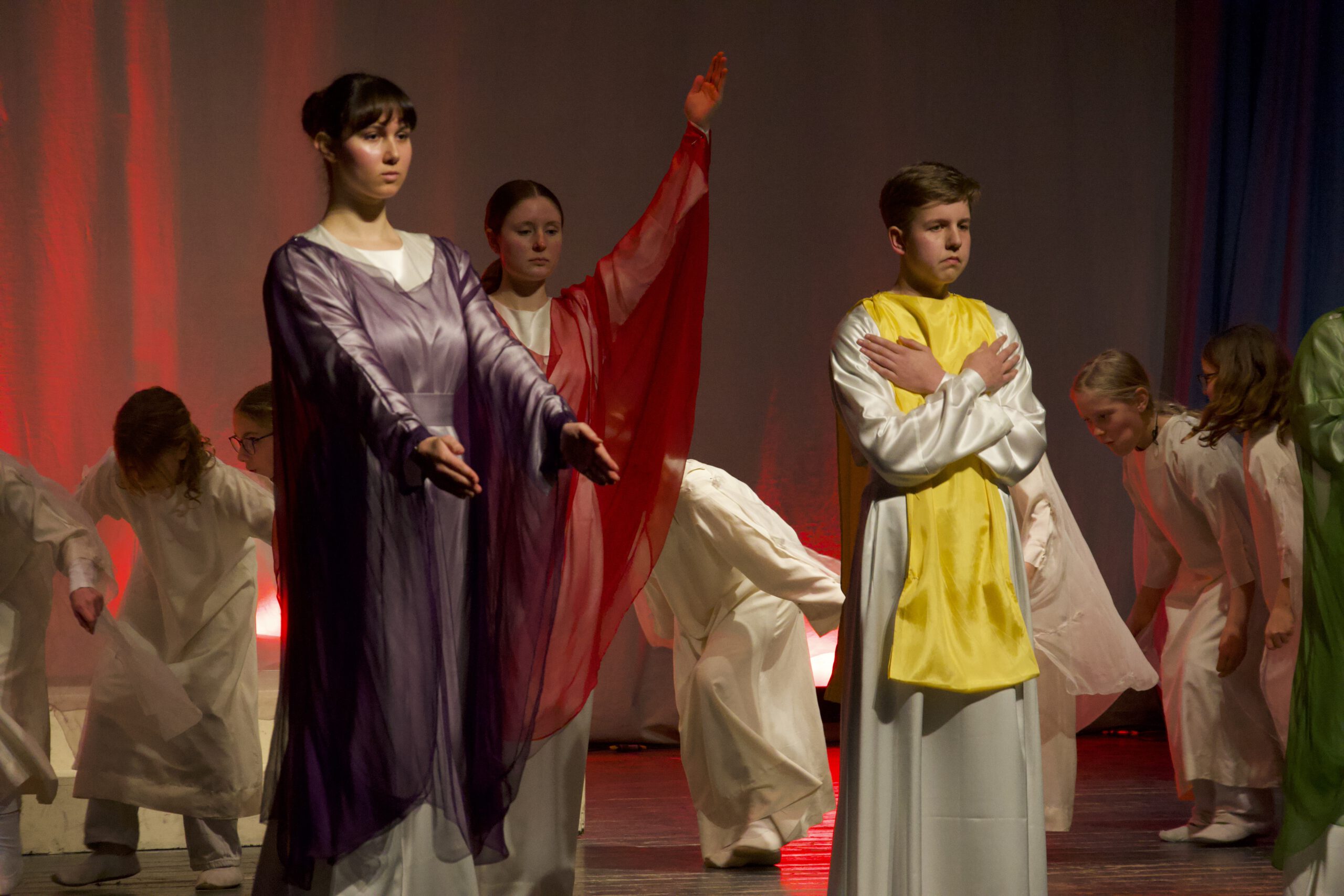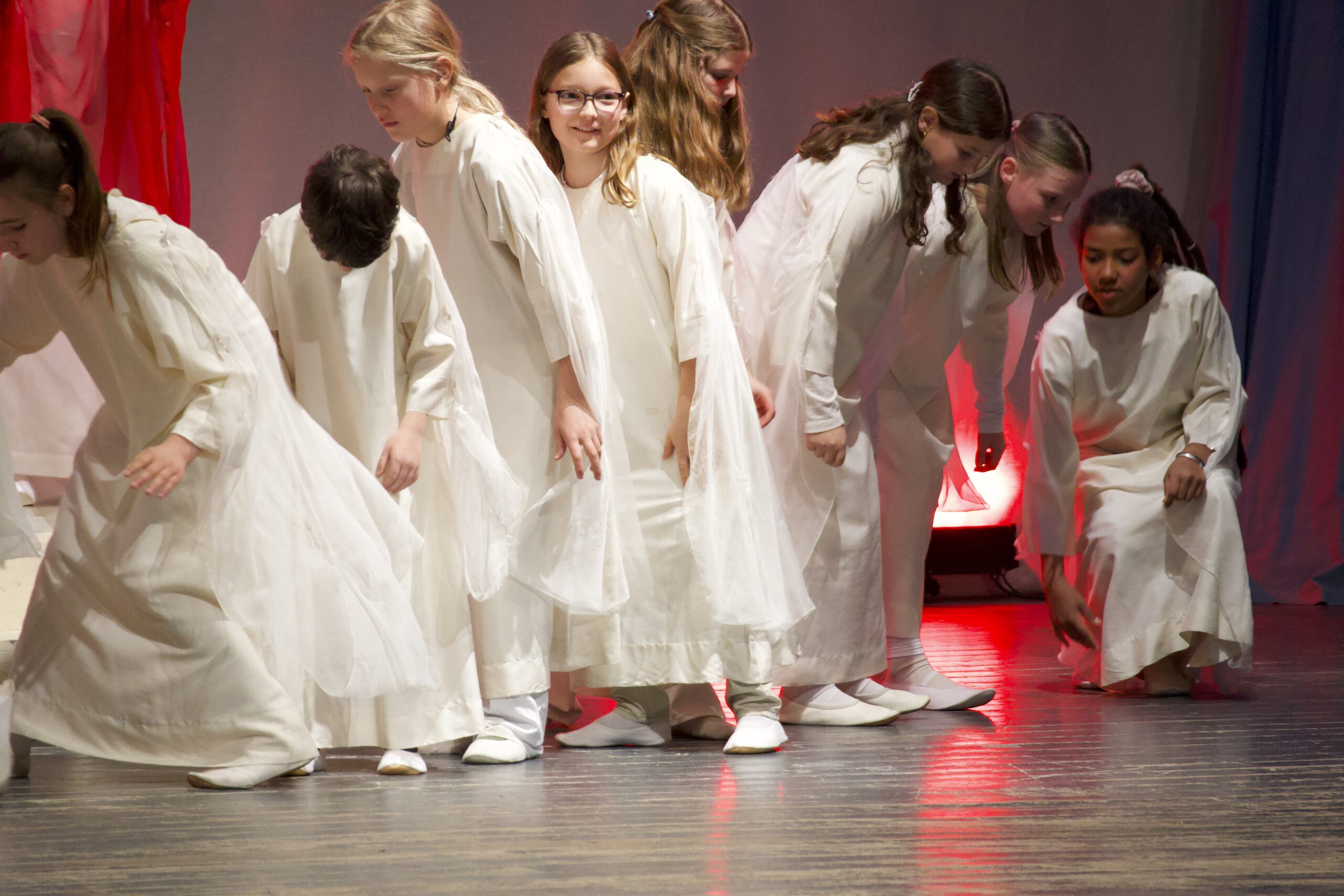 Besonders ist dieses Projekt nicht nur, weil beide 5. Klassen in aufwendiger Vorbereitung lange Zeit an den Bewegungen mit ihren Lehrerinnen üben, sondern auch, weil Schülerinnen und Schüler der 11. Klasse ebenfalls zur Darstellung beitragen.