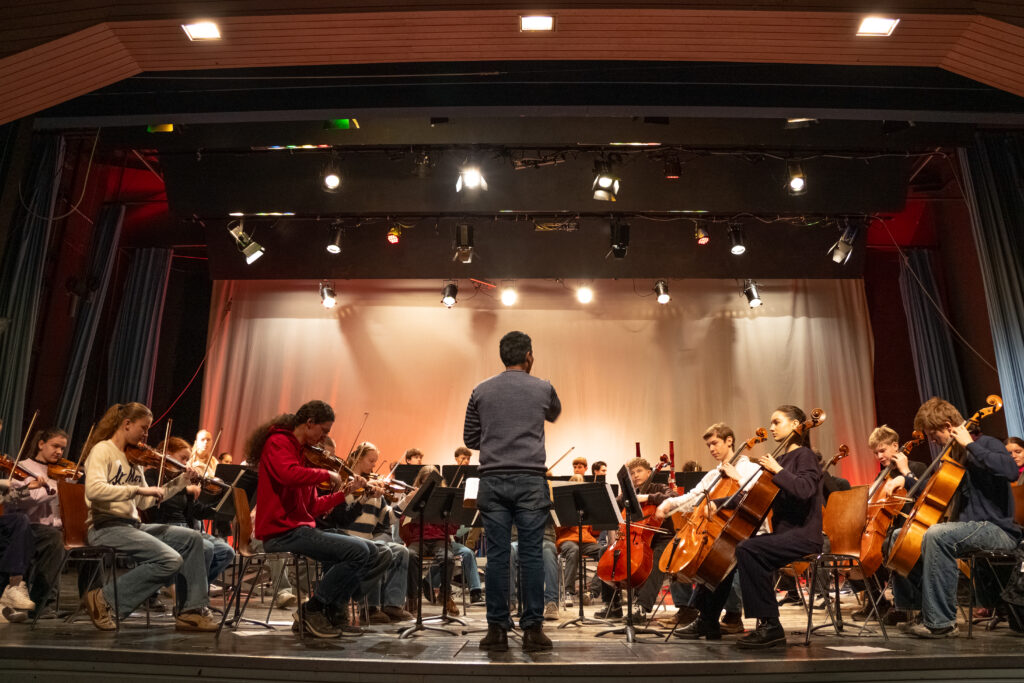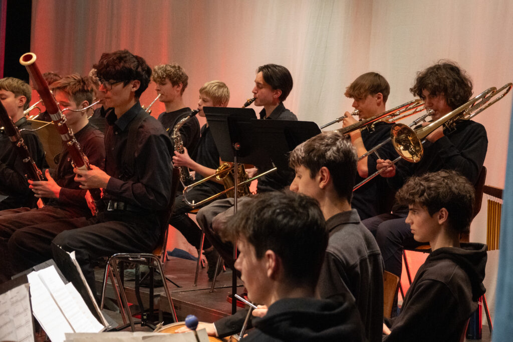 Das Oberstufenorchester zeigte sich dieses Jahr vielseitig: Die Beiträge fingen mit kleinen Formationen an, wuchsen immer weiter und gipfelten in sinfonischer Besetzungsstärke. Ein Barockes Blockflötenkonzert eröffnete das Programm, gefolgt von Stücken für Cello-Quartett und anschließend für größeres Streichorchester. Im Großformat gab es dann einen spanischen Tanz mit Kastagnetten, Klassiker z. B. von Sibelius und Bizet sowie Filmmusik von John Williams.
