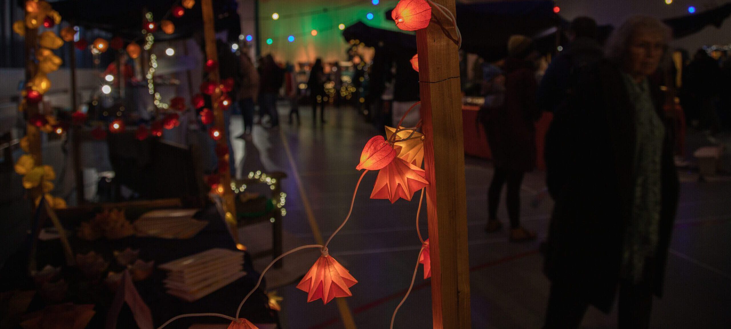 An den Verkaufsständen im großen Saal gibt es ein in liebevoller Handarbeit hergestelltes Angebot an besonderen Geschenken, wie Holzarbeiten, Transparentsternen, Wollbildern, Filzzwergen, Puppen und vielem mehr…