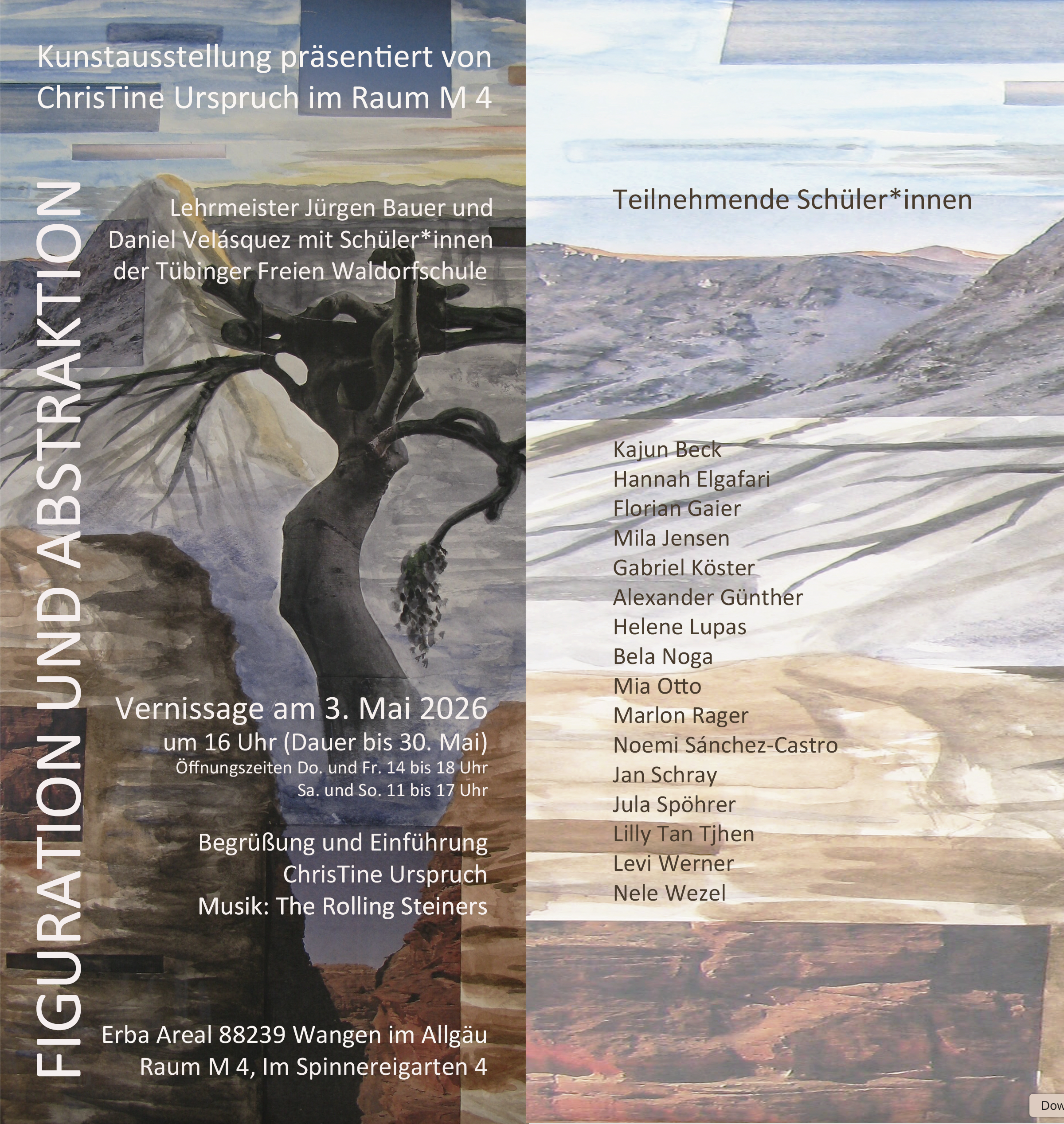 Die Schülerinnen und Schüler des Abi-Jahrgangs 2025 laden zu „Figur und Abstraktion“ in Wangen im Allgäu ein. Die Ausstellung zeigt Arbeiten aus den Bereichen Malerei und Skulptur und gibt Einblick in das künstlerische Schaffen des letzten Schuljahres.
